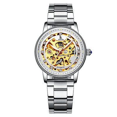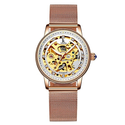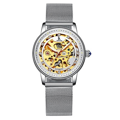 IK Colouring Ladies Wristwatch Automatic Stainless Steel Band Female Clock Mechanical Skeleton Rhinestone Women Watch
