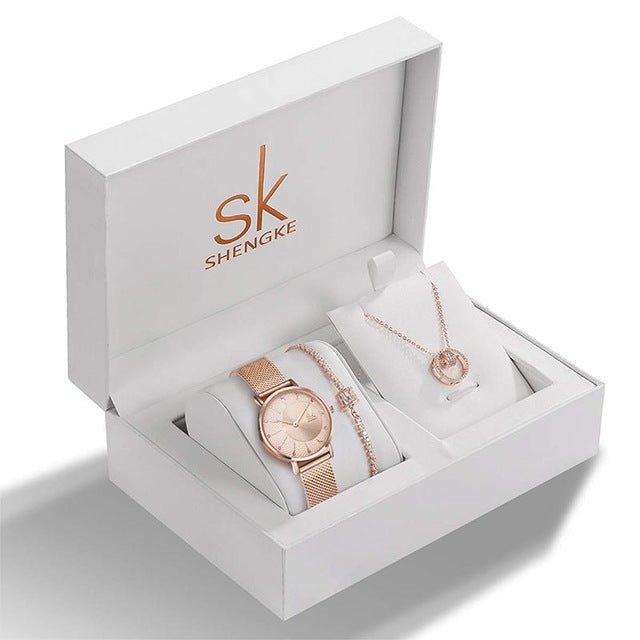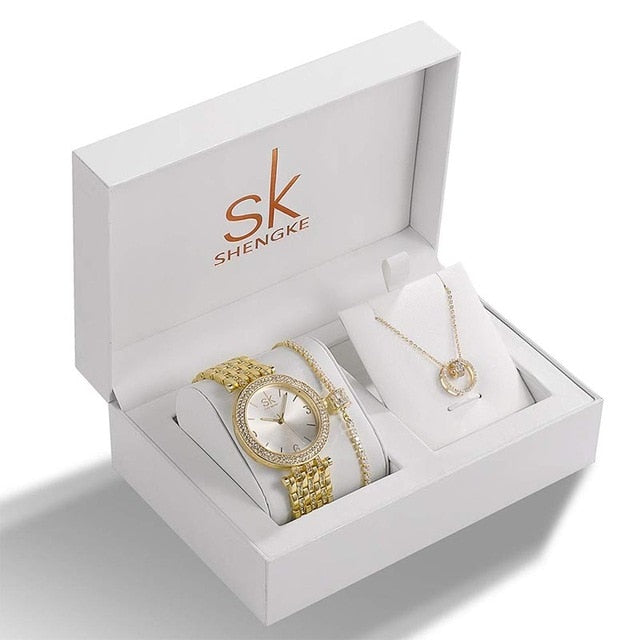 Shengke Top Brand Crystal Design Ladies Watch Bracelet Necklace Set Female Jewelry Luxury WristWatch Quartz Watch Lady's Gift